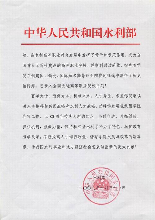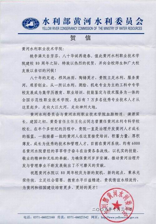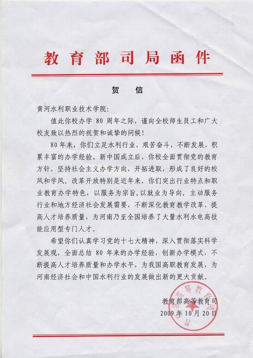 教育部高教司、水利部、黄委会为我院校庆发来贺信