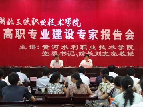 64下午,院党委书记、院长刘宪亮教授应邀到湖北三峡职业技术学院作题为《牢固确立专业建设核心地位》的辅导报告。报告会由三峡职院党委书记韩德锋同志主持。该院各系部主任、教学副主任、教务科长、教研室主任及骨干教师等100余人参会听取了报告。