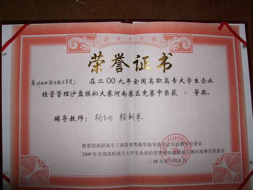 6768,由教育部高职高专工商管理教指委会组织的“2009年全国高职高专大学生企业经营管理沙盘模拟大赛”河南赛区比赛在商丘职业技术学院举行。经过激烈角逐,我院由财经系07级杨娟、于润等4位同学组成的代表队获得了二等奖。
