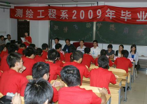 612下午,测绘工程系2009届学生毕业典礼在教学楼6402举行。系党总支书记周建郑、副书记刘广社、系主任赵杰,毕业班辅导员李忠旺、时璐、王崇景以及220余名毕业生代表参加了毕业典礼。学工办主任高琼主持毕业典礼。