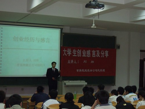 410下午,“曹操跑腿服务公司”总经理刘帅在教学楼6102为各系部学生代表作了“大学生创业感言及分享”的专题报告。
