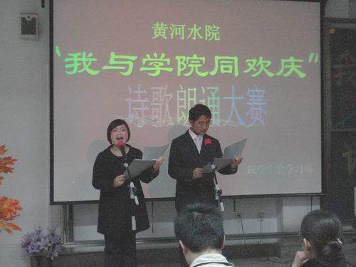 324,院学生会主办的“我与学院同欢庆”诗歌朗诵比赛总决赛在教学楼2503举行。出席此次比赛的有院团委副书记谷献晖、胡楠、李聪、赫黎闻以及各系部学生分会主席。