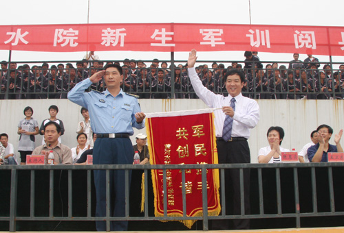 驻汴某部首长在大会上讲话。他对同学们军训取得的优异成绩表示祝贺,希望同学们一定要把军训中学到的好思想、好传统、好作风自觉地融入到大学生活中,并加以发扬光大,信心百倍地去迎接新生活的挑战。