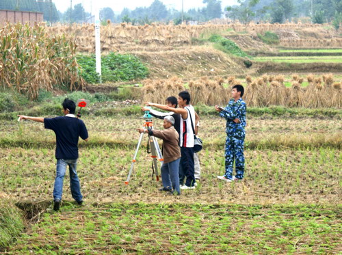 根据我院抗震救灾计划安排,我院援建测量突击队在进行彭州灾后重建地籍测量任务的同时,要对口支援四川水利职业技术学院40名学生的理论与实践教学。为此,我们专门制订了详细的培训计划。理论教学培训时间为60学时,其中地籍调查10学时;全站仪10学时,GPS 20学时,内业成图20学时;实践操作200学时,其中地籍调查60学时,全站仪40学时,GPS 80学时,内业成图120学时。在作业过程中,我们特意将两院学生混合编组,成立了10个测量小组,每组由2名我院学生和4名四川水院学生,他们互帮互学,结成了很好的对子。