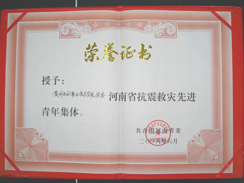 近日,共青团河南省委表彰了一批抗震救灾先进基层团组织,我院团委被共青团河南省委授予“河南省抗震救灾先进青年集体”。