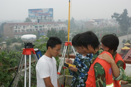刚到驻地,大家就马上投入了工作。我们首先在房顶架设了GPS接收机进行控制测量,为了保证控制点和界址点的精度,我们跑了80多公里的路程找寻国家埋设的等级三角点,并进行点校正。目前,10个测量小组已经全部分别进驻到红庙村、杨柳村、楠新村、文林村、群泊村、建新村等10个行政村开始紧张而有序的工作。另外,在工作的同时,指导老师注意加强对学生的培训和指导,使学生能更好更快的完成任务。