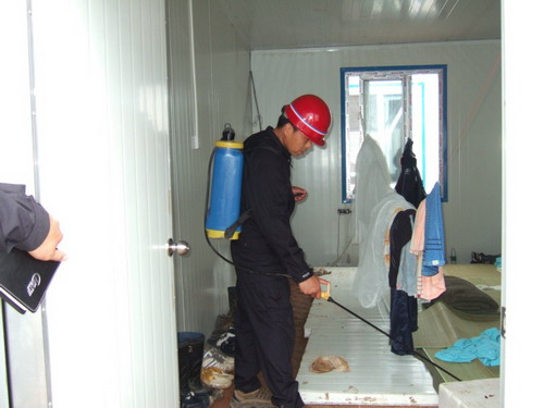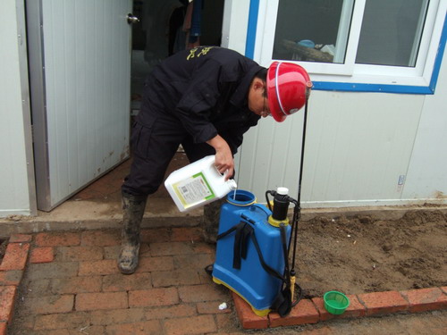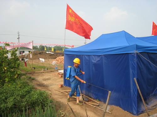 众所周知,大灾之后容易诱发大规模的疫情和传染病。此次四川特大地震发生之后,中央和地方政府反应迅速,立即投入了大量的人力、物力、财力进行专项防疫消毒,以确保大灾之后无大疫情。我们黄河水院抗震救灾突击队自从进入重灾区秀水镇以后,通过调查得知当地曾流行血吸虫病。鉴于严峻的形势,胡队长依据实际情况决定把安全卫生防疫工作放在首位。在学院领导、全院师生员工的关怀和支持下,我们提前购买了全套劳保用品、生活用品、应急药品、消毒制剂,并为每名队员发放全套日常生活用品和餐具。面对灾区恶劣的生活环境,和极其简陋的居住条件。我们在搭建好帐篷后就立即对住所进行了全面清洁消毒,并对炊具餐具单独进行消毒,以确保日常饮食安全。胡队长在入住灾区的当天就召开全体队员大会。他指出,根据灾区实际情况和指挥部要求,大家一定要做好安全卫生防疫工作,把好饮食关,防止肠道传染病的发生;洗漱和洗衣用水要用指挥部特意为我们准备的自来水,不能使用旁边小溪等自然水源的水;坚决不能喝生水;注意个人卫生及环境卫生;设立专门的垃圾桶;并要求炊事员的张长江老师和杨贵森老师从买菜、洗菜、煮饭、饭后清洁都要层层把关;不吃生菜和凉菜;洗菜时要加入洗洁精反复浸泡清洗,多蒸多煮以消除病菌,确保饮食卫生安全。