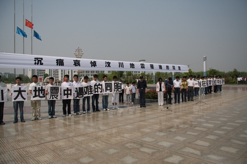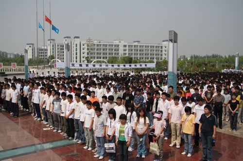 20085191428分,我院上空防空警报鸣响,院领导刘宪亮、张惠贞、孙五继、茹正波、王卫东、刘紫婷带领全院一万多名师生,和全国人民一起向四川汶川大地震遇难同胞默哀3分钟。
