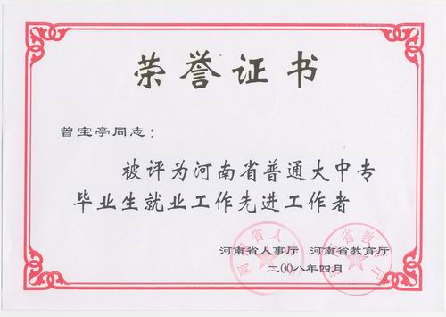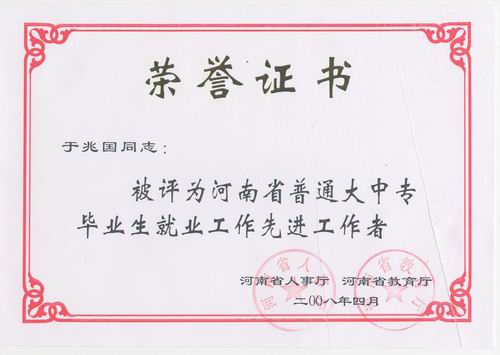 4月23日,在河南省毕业生就业工作会议上我院再次获得“河南省普通大中专毕业生就业工作先进集体”荣誉称号,这是我院连续三届荣膺此殊荣。同时,招生就业中心主任于兆国,就业办公室主任曾宝亭获得“河南省普通大中专毕业生就业工作先进工作者”称号。