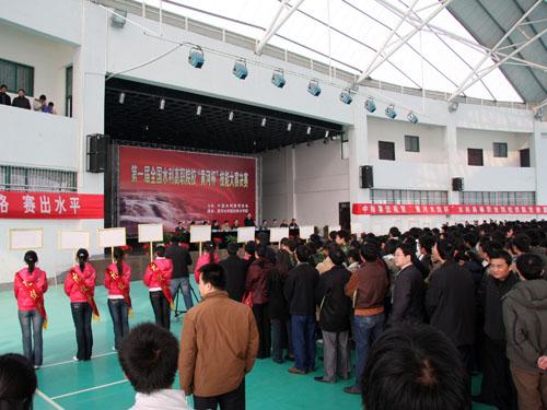 下午2点,在庄严的国歌声中,首届“黄河杯”技能大赛在风雨操场隆重开幕。