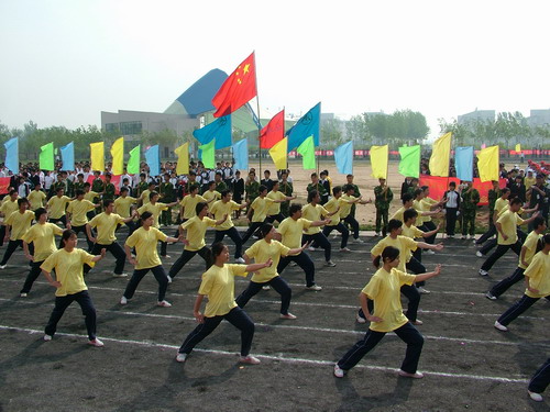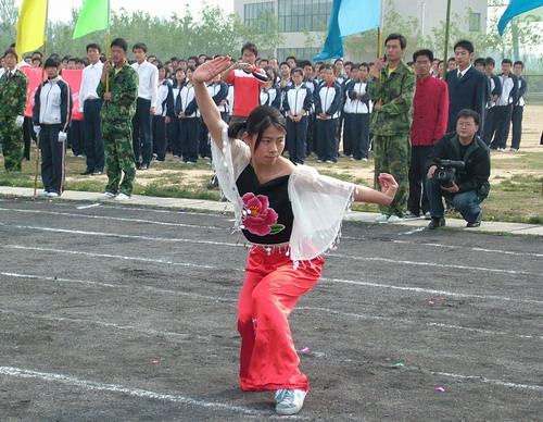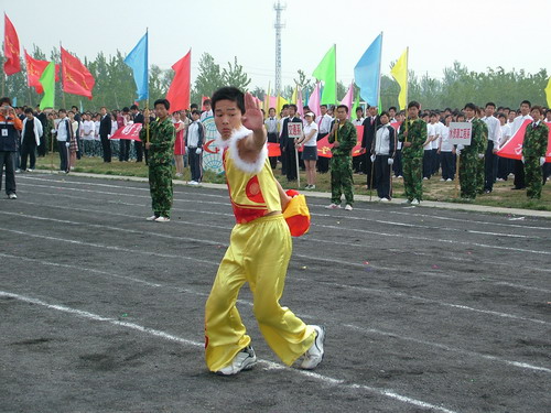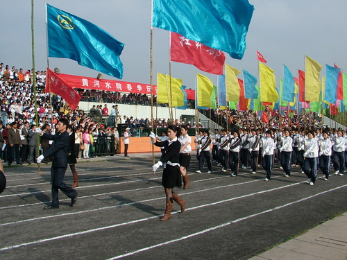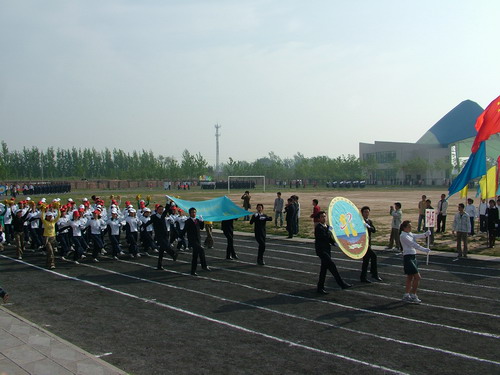 在社科部环境艺术设计专业学生组成的彩旗队的引导下,全院13个系部的运动员代表迈着整齐的步伐依次进入运动场。入场式后,体育部武术队还组织了武术表演,太极拳表演轻松柔和、圆活自然,刀、枪、剑、拳等武术表演刚劲有力,展现了大学生健康、向上的精神风貌。