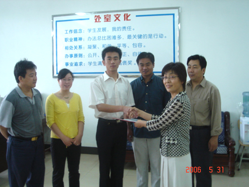 在5月31日,学生工作部(处)刘紫婷部长亲自把“河南省文明学生”荣誉证书颁发给赵铁拓同学。赵铁拓同学是交通工程系二年级学生,现担任该系学生会主席。他入学以来,严格要求自己,努力学习,积极要求上进,曾获得我院一、二等奖学金,并被评为院级优秀学生干部和省级三好学生。