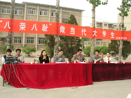 各系部“八荣八耻”宣传教育活动开展的也如火如荼。4月18日下午,机电工程系在我院北校区隆重举行了一次以“树‘八荣八耻’,做当代大学生”为主题的教育活动。机电系党委副书记朱焕立以自己的亲身经历教育了同学们要从日常的小事做起,从自身做起,以实际行动践行“八荣八耻”。该系党总支书记杨化书希望同学们要做新时代的大学生,树立正确的荣辱观,他要求所有的辅导员老师、学生干部和学生认真学习领会“八荣八耻”的内涵,以实际行动来实践“八荣八耻”。