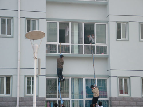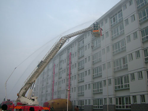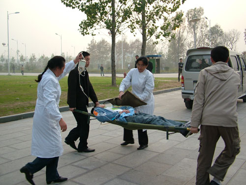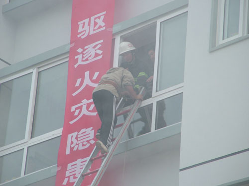 开封市消防支队5辆消防车呼啸而至,展开灭火救援工作。两个高压水枪同时扑向“火龙”;消防官兵迅速向327、329房间架设梯子,一名消防队员从消防梯爬上了327房间,并迅速解下安全带,系在一位学生身上让其顺着梯子逃生,在保卫处王志刚、何长胜组织下学生按顺序撤离;一个巨大救生气垫已经被充起,在消防人员的指挥下,部分被困3楼的学生正有间隔、有顺序的跳向气垫的中心逃生;与此同时,我院的医务人员也赶到现场,对伤员进行紧急救治。这时,发现6楼有被困学生发出求救信号,消防支队迅速调来一辆曲臂登高车,进行高空人员疏散。