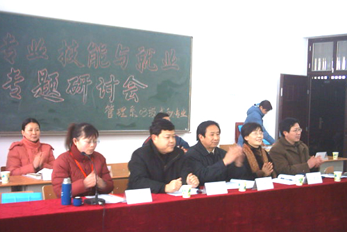 为加强学生的专业技能训练,培养学生的组织、管理能力,管理系03级文秘专业的学生结合秘书学课程实训环节,在专业老师的指导下,于1月14日下午在新校区七号楼307室举办了一场别开生面的会议——“大学生专业技能与就业专题研讨会”。