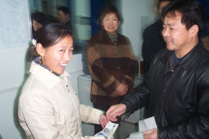 11月25日下午,当经管系教工党支部书记董淑芳老师和经管系学生党支部书记陈志强老师把代表全系17名党员心意的300多元钱交到了贫困生张利蕊、张翔飞手里时,两位同学露出幸福的笑容。