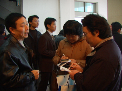 值得一提的是,笔者在见面会现场看到测绘系副主任周建郑老师手里拿了几份就业协议,上面显示该系2005届毕业生已经被预订了。因为今年毕业生数量有限,而用人单位计划多,该系就大胆的向用人单位推荐了尚读大二的学生。