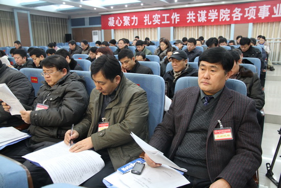 纪委书记、工会主席张豫东作《工会工作报告》,报告指出,第一届教职工暨第一次工会会员代表大会以来,院工会围绕学院中心工作,以构建和谐校园、服务科学发展为主线,发挥自身优势,认真履职尽责,积极推进学院民主建设进程,切实维护学院整体利益,全心全意为教职工做好事、办实事、解难事,为学院的改革、发展、稳定作出了积极贡献。同时,报告还从进一步完善教代会制度,强化民主管理;抓好师德建设,不断提高教职工队伍整体素质;实施校园文化建设工程,构建和谐校园环境;深入开展“教工之家”创建活动,努力创建国家级“模范教工之家”;加强工会自身建设,激发工会深层活力;为教职工办实事、办好事、解难事等6个方面阐述了下一步的工作任务。
