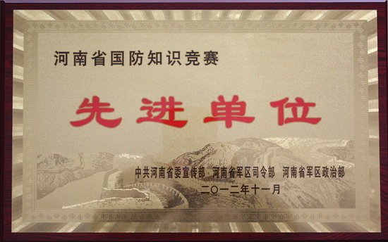 10月,在中共河南省委宣传部、河南省军区司令部、河南省军区政治部组织的河南省国防知识竞赛活动中,学生处、武装部组织学生9000人参赛。最终我院荣获河南省国防知识竞赛先进单位,土木工程系工程造价1204班学生赵露露被评为优秀奖。