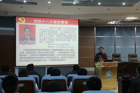 为使广大学生更加深入了解党的十八大报告精神及其内涵,11月22日下午,由我院思政部胡引生副教授作的《承上启下、科学发展、铸就辉煌——党的十八大报告解读》专题讲座在院学术报告厅举行,院团委、各系分团委人员及200余名学生聆听了讲座。