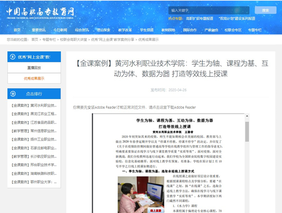 为深入贯彻落实国家“进一步做好在线教育教学”精神,保障在线教学质量,总结教师在线教学的优秀做法和教学成效,形成可复制可推广的典型经验和模式,全国高职高专校长联席会议组织开展了如何打造优秀“网上金课”在线分享活动。我校王勤香教授的《学生为轴、课程为基、互动为体、数据为器 打造等效线上授课》案例成功入选。