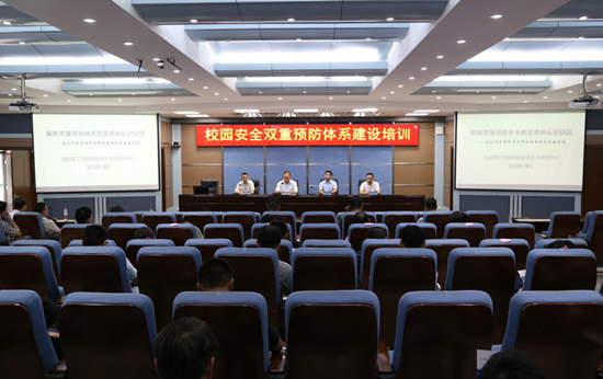 为进一步扎实推进和有效落实我校校园安全双重预防体系建设工作,7月9日下午,我校在3号实训馆报告厅召开校园安全双重预防体系建设培训会。会议邀请河南省教育厅安全智库专家张克胜博士、洛阳众智软件科技股份有限公司软件实施工程师朱文克老师等来校培训指导。副校长杨士恒出席会议,党政办公室、保卫处、学生处、各教学院(部)等部门负责人,科级干部及部分实训课教师代表参会。会议由党政办公室主任朱焕立主持。