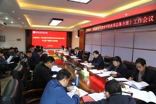 4月15日上午,我校在行政楼第一会议室召开贯彻落实《深化新时代教育评价改革总体方案》(以下简称“《总体方案》”)工作会议,安排部署我校贯彻落实《总体方案》相关工作,组织学校中层正职领导开展培训学习。副校长刘玉宾出席会议,党政办公室、党委组织部、党委宣传部、教师工作部、学生工作部、教务处、科技处、发展规划处、招生就业服务中心等相关职能部门负责人,各党总支(直属党支部)书记以及党政办公室相关人员参会。