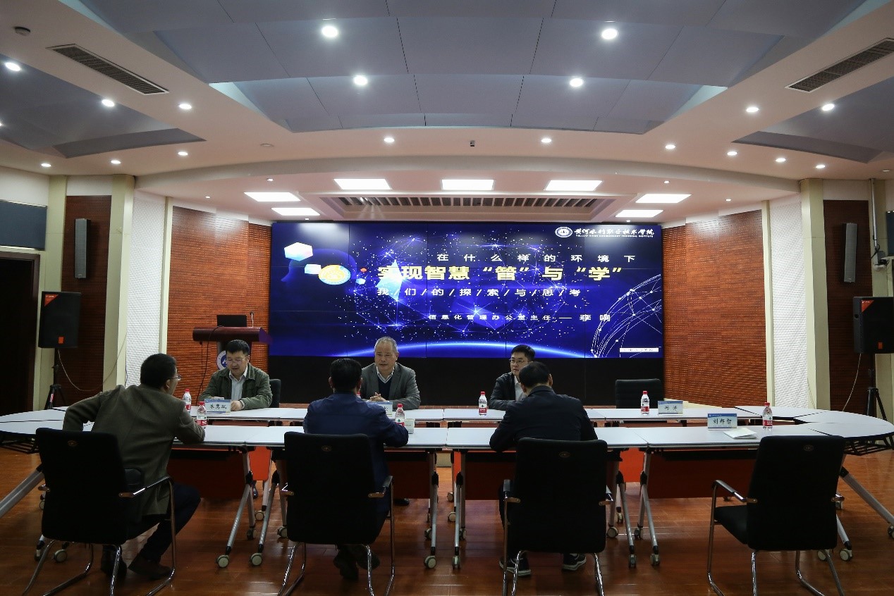 参观完毕后,副校长杨士恒、质量管理办公室主任(教务处副处长)朱惠斌、信息化管理办公室主任李响与来访客人围绕信息化建设促进学校实现智慧“管”与“学”方面的探索与思考进行了座谈交流。(供图:信息化管理办公室)