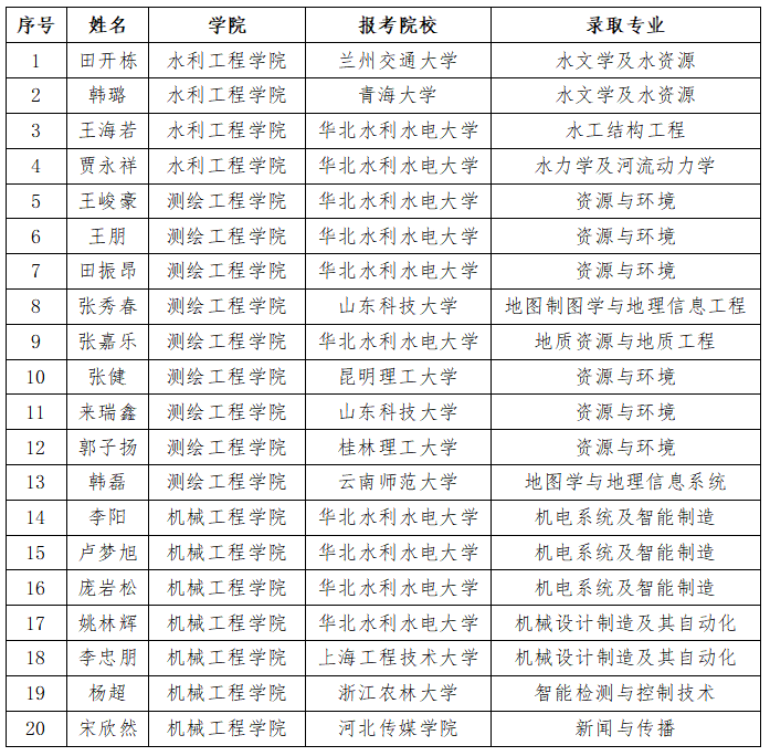 近日,2021年全国硕士研究生录取结果陆续揭晓,我校与华北水利水电大学联办的本科2021届毕业生考研捷报频传,20名学生顺利考取华北水利水电大学、兰州交通大学、昆明理工大学等高校硕士研究生。