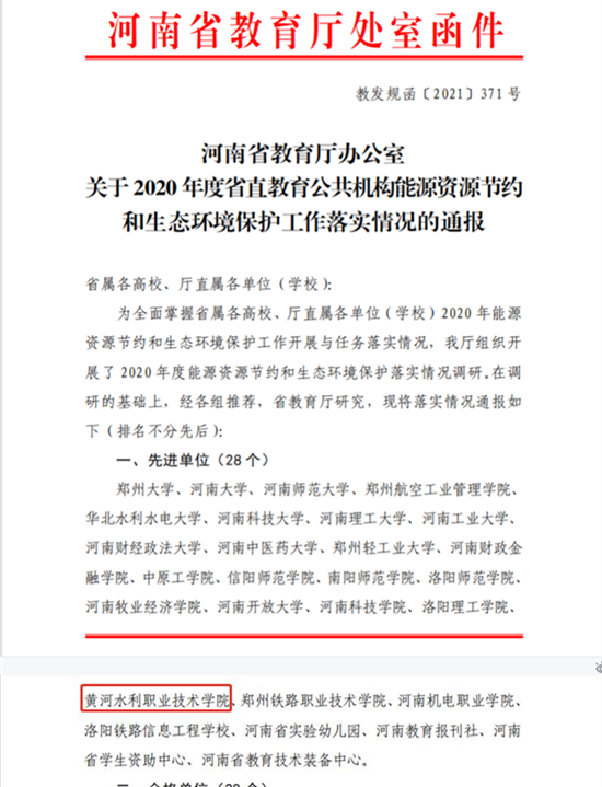 近日,河南省教育厅下发《关于2020年度省直教育系统公共机构能源资源节约和生态环境保护工作落实情况的通报》(教发规函〔2021〕371号),我校再次获评为省直教育系统公共机构节能先进单位,这是继我校2016年以来第四次被评定为考核先进单位。
