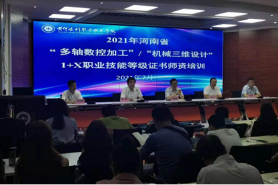 为进一步推进“学历证书+若干职业技能等级证书”制度落实,完善职业教育和培训体系,深化产教融合,7月6日上午,我校机械工程学院举办2021年1+X“数控多轴”、“机械三维设计”2个省级师资培训开班仪式。教务处长薛建荣、北京数码大方科技股份有限公司河南区教育总监朱彦军、广州中望龙腾软件股份有限公司华大区经理张莹婕、机械工程学院领导班子成员及来自省内的20所中高职院89名教师学员参会。