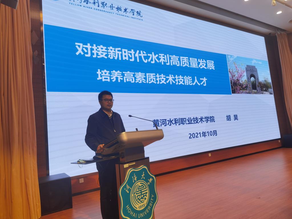 胡昊以对接新时代水利高质量发展 培养高素质技术技能人才为题,围绕“六个着力、六个打造”汇报了我校培养高素质技术技能人才的一些经验和做法。一是在特色上着力,打造服务水利高质量发展培养体系。聚焦“黄河为魂、水利为根、工程为基、育人为本”的办学特色,构建“聚焦(高质量发展)-对接(水利建设)-服务(水利行业)”的专业体系。二是在标准上着力,打造水利职业教育高质量发展标杆。牢固树立专业建设核心地位,通过“精准专业定位塑品牌、精准课程建设强内涵、精准培养模式育人才”“三精准三打造”,建成一批标准,形成“水利职业教育标杆”。三是在服务上着力,打造服务水利工程建设新平台围绕黄河国家战略“抓科研、抓项目、抓服务”,政行企校携手发展,提升服务水利发展的能力。四是在文化上着力,打造新时代水利精神文化涵育殿堂。围绕“彰显水利人‘忠诚、干净、担当’可贵品质,厚植水利行业‘科学、求实、创新’价值取向”开展文化环境建设和教育活动,打造“校园大职场”和校园特色水利文化。五是在开放上着力,打造水利职业教育国际化样板。开创“培养留学生、服务走出去企业本地化项目建设”的留学生培养模式。携手国内知名水电企业,依托海外工程项目,打造“1+N+M”中外分布式大禹学院。六是在质量上着力,打造水利技术技能人才培养高地。对接水利企业新需求,深化产教融合,搭建“两条主线、一套方案、双向目标、模块设计”协同育人体系,不断提高人才培养质量。
