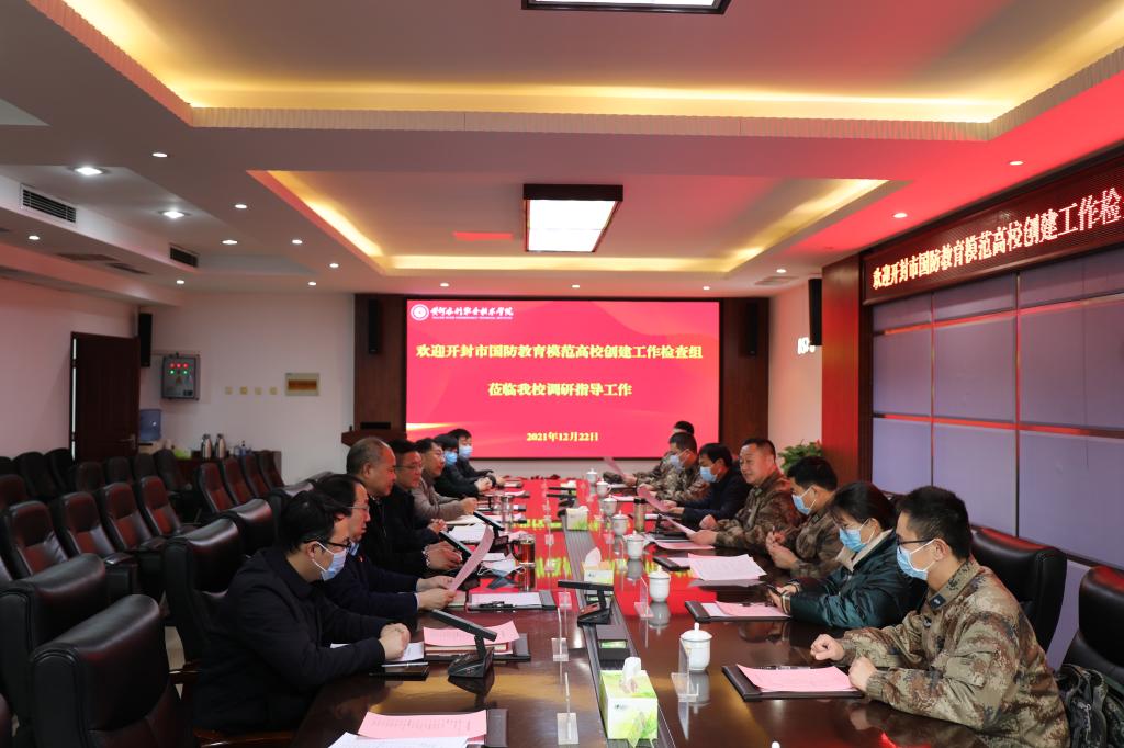 12月22日上午,开封军分区副司令员崔瑜带领军分区、市委宣传部、市教体局相关部门负责同志一行8人到我校开展国防教育模范高校创建工作检查考评。校党委副书记、工会主席杨士恒,校党委副书记刘卫锋,党政办、组织部、宣传部、学生工作部、教师工作部、武装部、教务处、团委等部门负责同志参加了考评。会议由党委副书记刘卫锋主持。