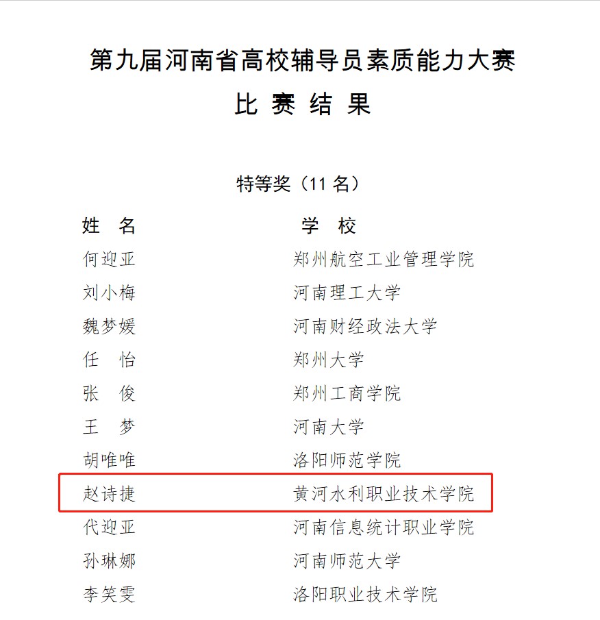 近日,第九届河南省高校辅导员素质能力大赛在河南理工大学举行,来自全省130所高校的133名选手参赛。我校水利工程学院辅导员赵诗捷凭借昂扬的精神风貌、扎实的业务功底、缜密的逻辑思维、出色的语言表达及过硬的综合能力,一路过关斩将,最终荣获大赛特等奖,其优异成绩在全省高职院校中位列第一。