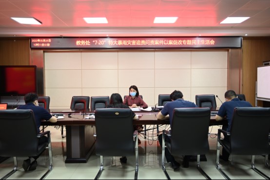 5月26日上午,教务处领导班子在5号实训馆219室召开“7.20”特大暴雨灾害追责问责案件以案促改专题民主生活会,副校长焦爱萍全程参加并指导会议。教务处领导班子成员参会,会议由教务处处长陶永霞主持。