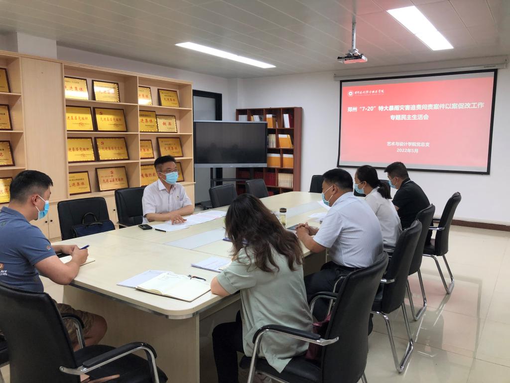 5月27日上午,艺术与设计学院党总支在5号实训楼616室召开郑州“7· 20”特大暴雨灾害追责问责案件以案促改专题民主生活会,校党委副书记刘卫锋到会指导工作,学院领导班子、总支办公室和行政办公室主任、纪检委员参加会议。会议由院党总支书记耿亚杰主持。