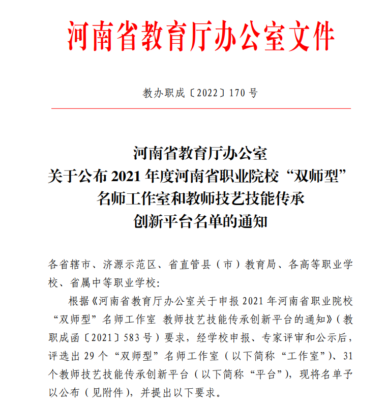近日,河南省教育厅办公室发布《河南省教育厅办公室关于公布2021年度河南省职业院校“双师型”名师工作室和教师技艺技能传承创新平台名单的通知》(教办职成〔2022〕170号),我校冯峰教授主持的“水生态修复技术”获评河南省职业院校“双师型”名师工作室,张延教授主持的“机械设计与制造”获评河南省职业院校教师技艺技能传承创新平台。至此,我校已获评河南省职业院校“双师型”名师工作室和教师技艺技能传承创新平台各2个。