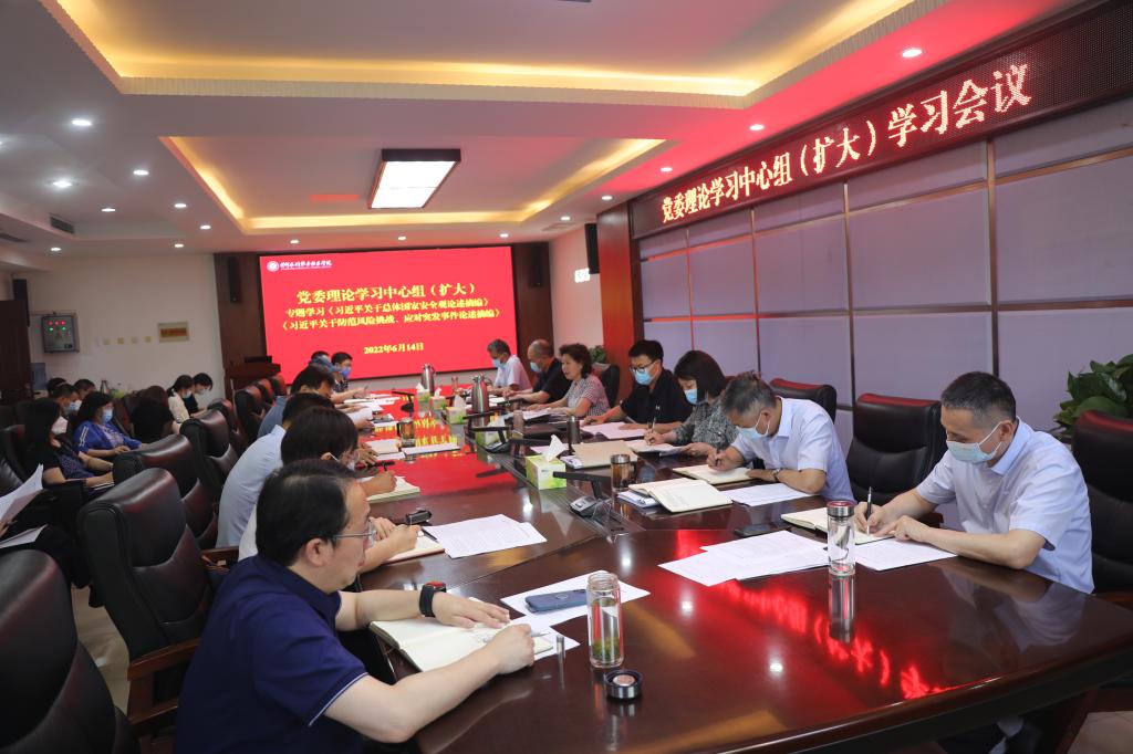 6月14日下午,校党委书记周保平在行政楼第一会议室主持召开校党委理论学习中心组(扩大)学习会议,专题学习《习近平关于总体国家安全观论述摘编》《习近平关于防范风险挑战、应对突发事件论述摘编》等文献的重要内容。周保平、胡昊、杨士恒、焦爱萍、刘玉宾、菅浩然、朱焕立等校领导,各党总支书记(直属党支部书记),一站式学生社区党工委书记,环境工程学院院长,信息工程学院院长,党政办公室、党委组织部、党委宣传部、纪委、学生工作部、教师工作部、保卫部、教务处、工会、团委、科技处、信息化管理办公室等部门负责人参加学习。