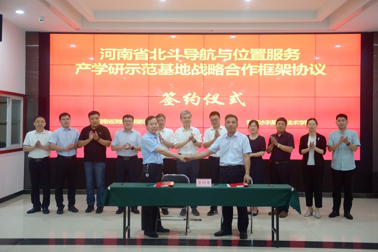 菅浩然代表学校与企业签订了河南省北斗导航与位置服务产学研示范基地战略合作框架协议。