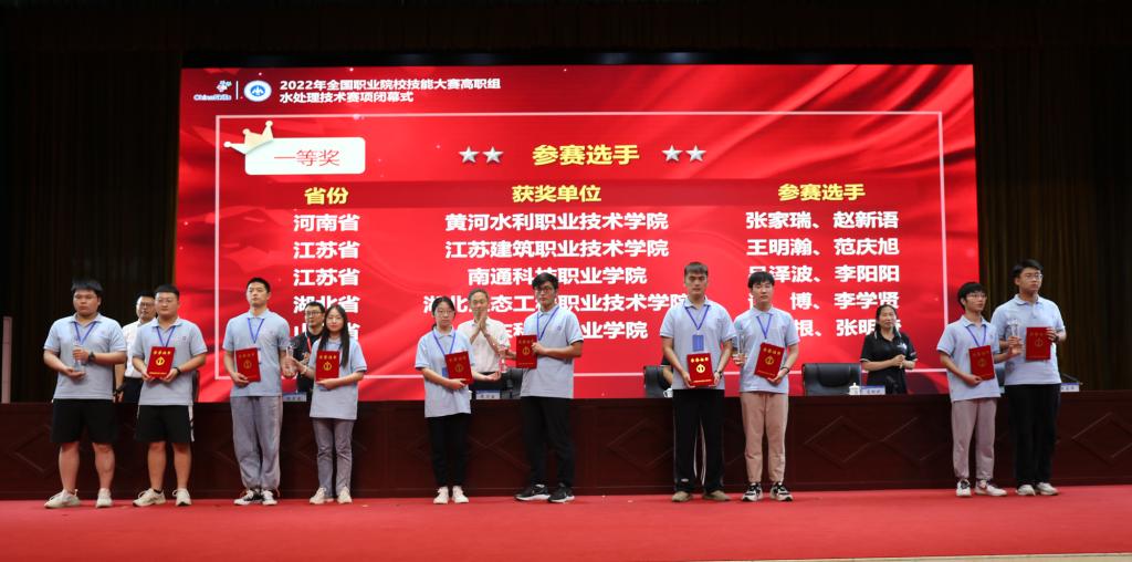 陈卫东宣布竞赛成绩。黄河水利职业技术学院、江苏建筑职业技术学院、南通科技职业学院、湖北生态工程职业技术学院、山东科技职业学院等5个代表队荣获一等奖。河北工业职业技术大学、杨凌职业技术学院、浙江同济科技职业学院、广东环境保护工程职业学院、广西水利电力职业技术学院、重庆水利电力职业技术学院、北京电子科技职业学院、杭州职业技术学院、天津渤海职业技术学院、安徽水利水电职业技术学院等10个代表队荣获二等奖。福建水利电力职业技术学院、重庆工程职业技术学院、湖南水利水电职业技术学院、江西环境工程职业学院、福建农业职业技术学院、兰州资环大学、湖南化工职业技术学院、神木职业技术学院、威海海洋职业学院、贵州工业职业技术学院、辽宁省交通高等专科学校、贵州水利水电职业技术学院、湖北工业职业技术学院、广西生态工程职业技术学院、广东水利电力职业技术学院等15个代表队荣获三等奖。获得一等奖的代表队指导老师获评优秀指导教师。与会领导分别为获奖选手和优秀指导教师颁奖。