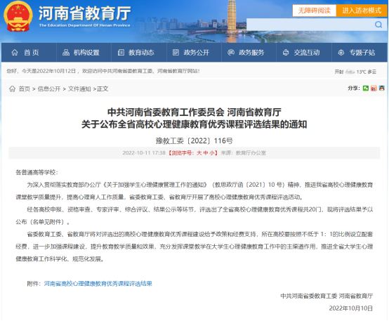 近日,中共河南省委教育工作委员会、河南省教育厅印发《关于公布全省高校心理健康教育优秀课程评选结果的通知》(豫教工委〔2022〕116号),全省共评选出20门优秀《大学生心理健康教育》课程,其中本科院校16门、高职院校4门,我校王超老师负责的《大学生心理健康教育》课程位列其中。