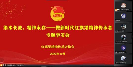 为学习习近平总书记在河南安阳考察时的重要讲话精神,继承和弘扬伟大的红旗渠精神,10月29日,红旗渠精神传承者协会线上开展“渠水长流,精神永存—做新时代红旗渠精神传承者”专题学习会,协会全体成员、各学生组织成员、各学院学生代表等200余人参加活动。