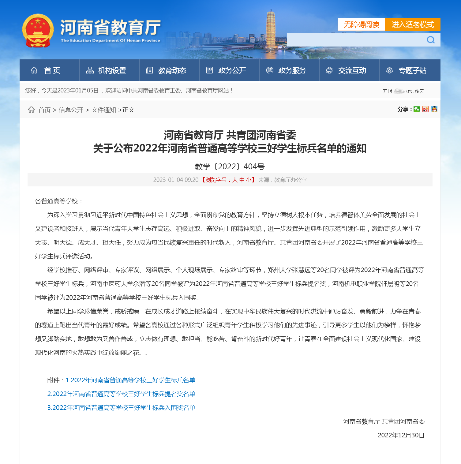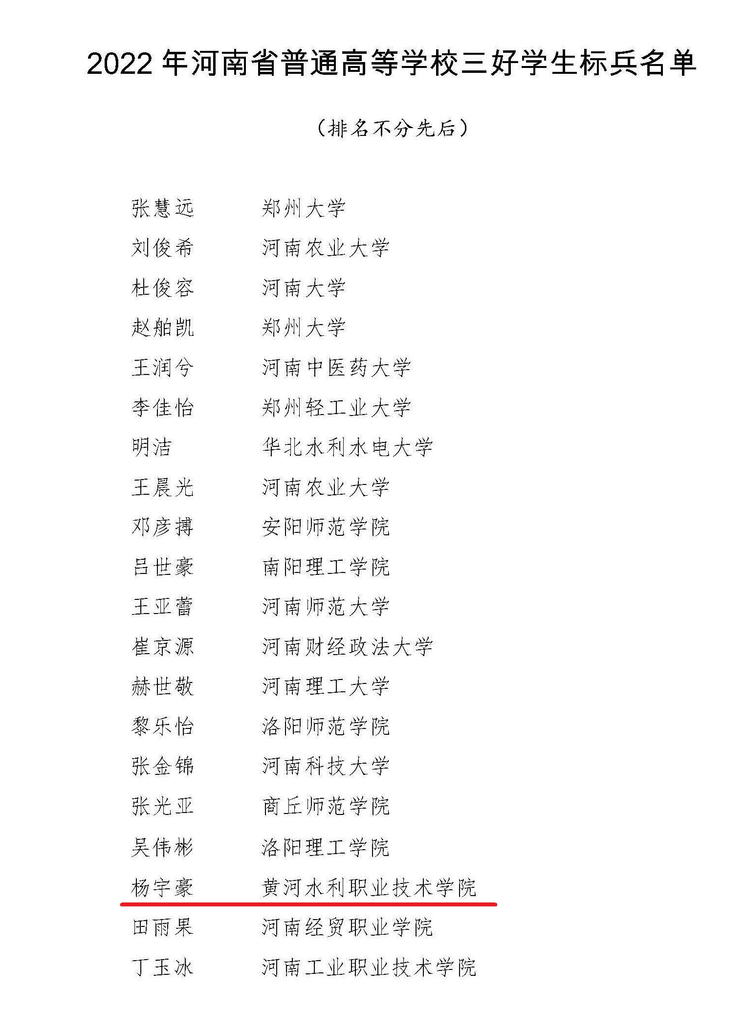 近日,河南省教育厅 共青团河南省委发布了《关于公布2022年河南省普通高等学校三好学生标兵名单的通知》(教学〔2022〕404号),我校土木与交通工程学院杨宇豪同学被评为2022年河南省普通高等学校三好学生标兵。