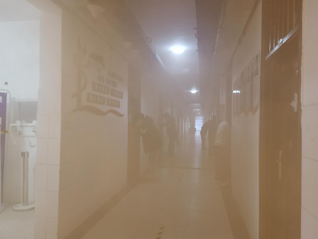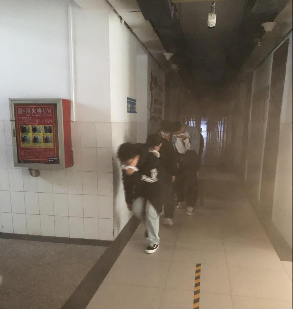 活动最后,在5号学生公寓开展了宿舍疏散逃生演练,模拟因违规使用插排导致宿舍床铺起火的情况,在烟雾弹的烟雾中,同学们迅速反映,及时通知楼管员和周边宿舍,楼管员第一时间进行全楼断电、打开逃生门,并拨打了火警电话和校内报警电话。在义务消防宣传员和楼管员的引导下,楼内学生用毛巾捂住口鼻,俯身有序撤离,迅速转移到安全地带。