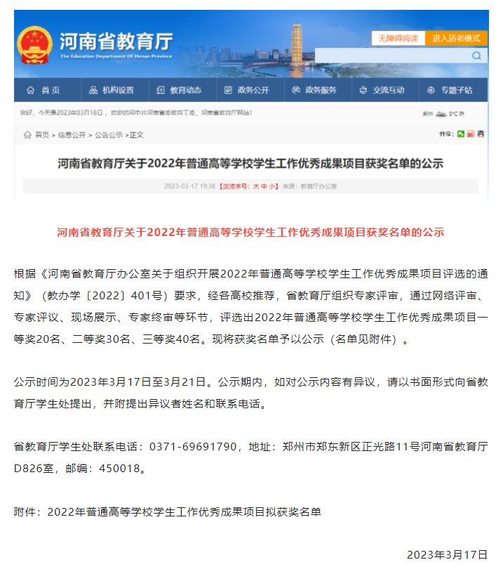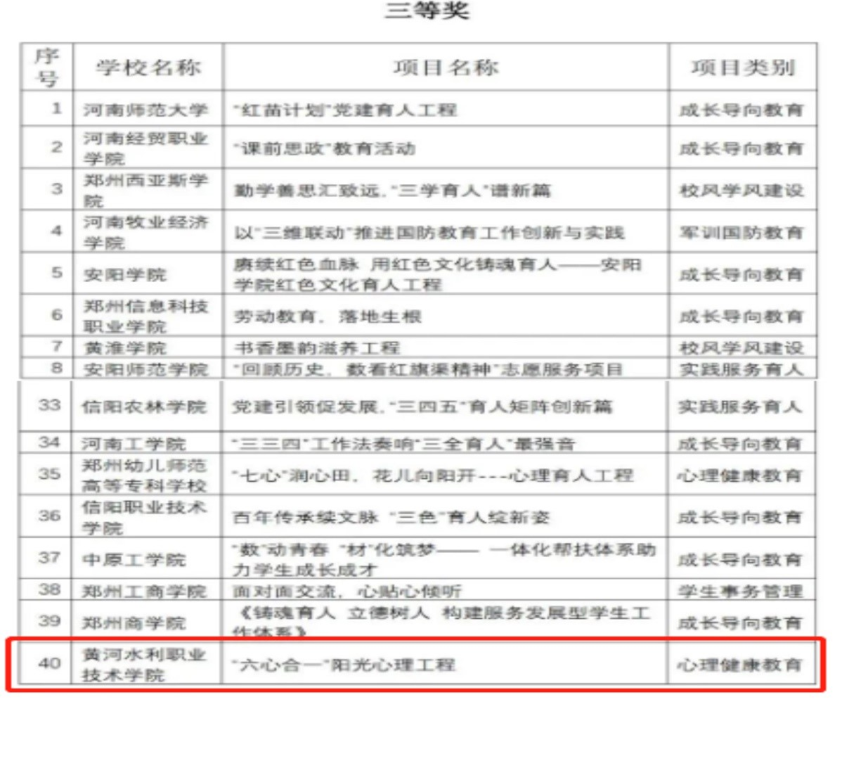 近日,省教育厅发布了2022年普通高等学校学生工作优秀成果项目获奖公示名单,我校《“六心合一”阳光心理工程》项目在2022年河南省普通高等学校学生工作优秀成果评选中荣获三等奖。