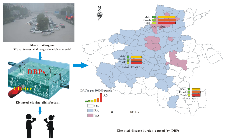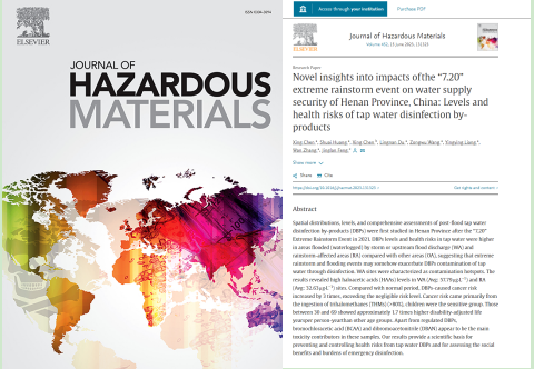 该论文是胡昊校长为子课题负责人的河南省重大专项“南水北调中线工程水生态环境保护关键技术研究及示范”的最新研究成果,得到了河南省重大专项项目(221100320200)、河南省自然科学基金项目(232300420454)的支持。论文以2021年“7.20”河南极端暴雨事件为案例,结合样品采集和实验室分析,基于气相色谱法分析技术和环境风险综合评估模型,首次揭示了暴雨内涝事件后自来水厂的应急消毒措施会加剧自来水中消毒副产物(Disinfection by-products,DBPs)污染。为当前极端降水灾害频发背景下,水患后自来水过度消毒所造成的居民健康负担的预防和管理提供了科学依据。