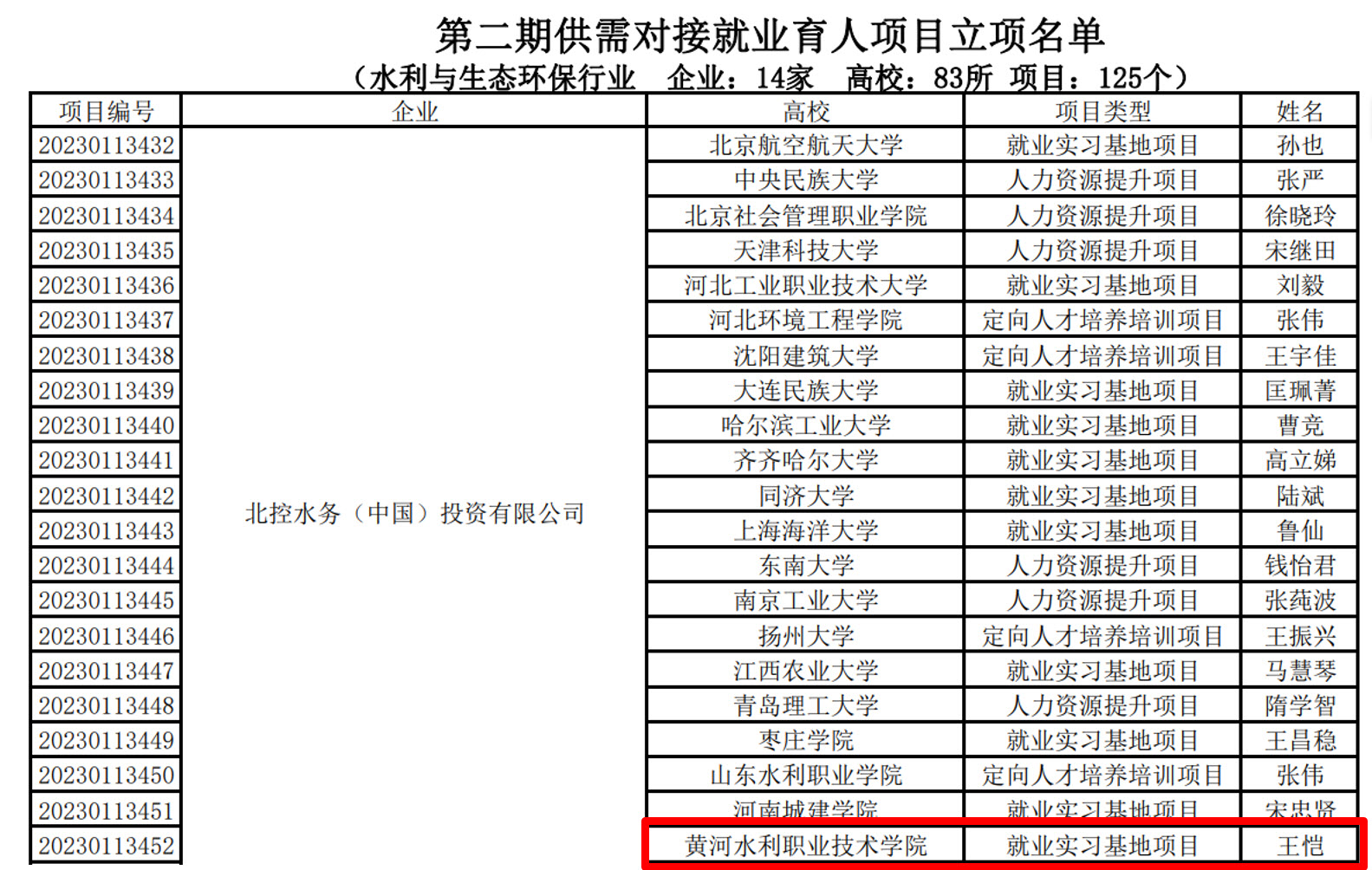 近日,教育部高校学生司正式发布了《关于公布第二期供需对接就业育人项目立项名单的通知》,由我校环境工程学院王恺副教授主持“黄河水利职业技术学院与北控水务(北京)投资有限公司供需对接实习就业育人基地”项目成功获批立项。