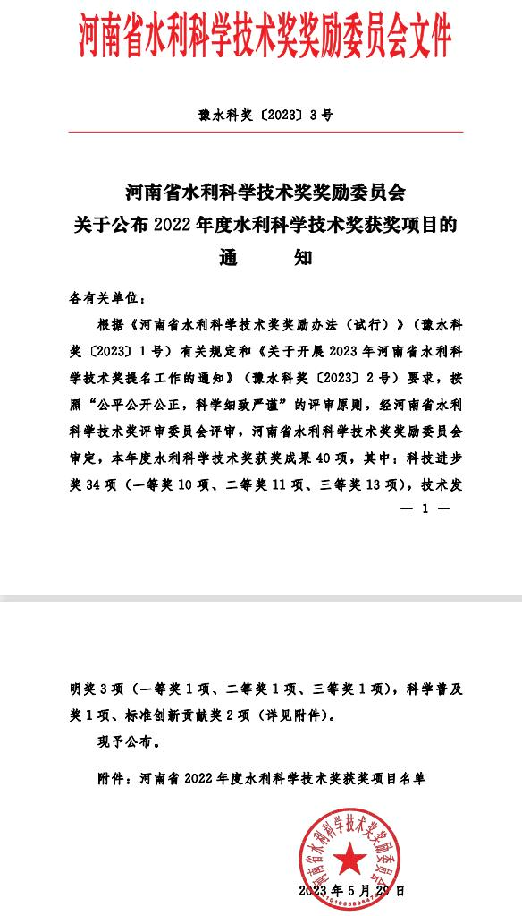 河南省水利科学技术奖评选是由河南省水利厅组织开展的水利科学技术创新成果申报工作,是贯彻落实我国新时期“十六字”治水方针和我省“四水同治”治水新理念,促进水利科技进步的重要举措,在鼓励水利科技工作者勇于创新方面起到积极的推动作用。此次我校两项成果喜获二等奖,展示了我校科研团队在科技创新、技术研发、推广应用等方面取得的成果,也将为我校“双高计划”建设、职业本科申报奠定良好的基础。