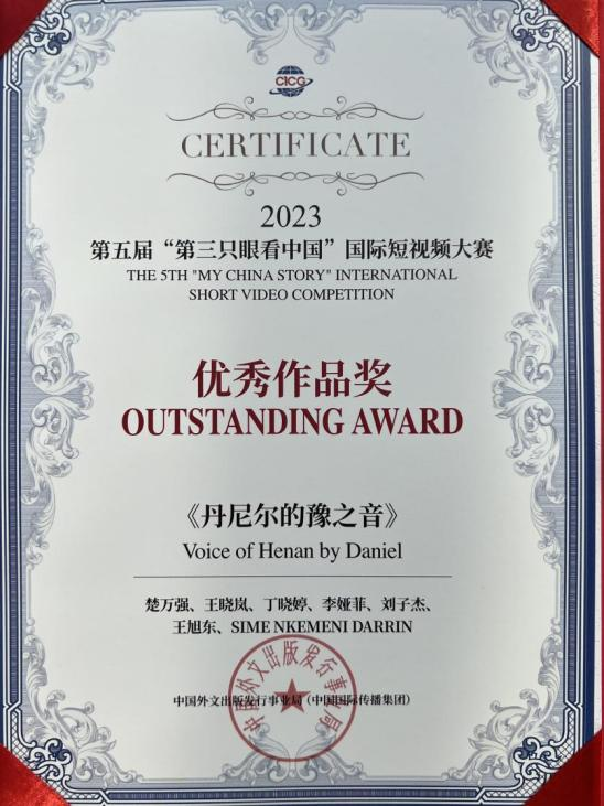 第五届“第三只眼看中国”国际短视频大赛共征集到来自世界各地作品57865部,覆盖五大洲的80多个国家,投稿作品平台阅读量达到4.3亿,最终评选出各类奖项共计96个。活动自6月份启动以来,国际教育学院精心筹备组织,结合我校留学生丹尼尔的学习生活经历,真实的展现了留学生学习豫剧的过程,将豫剧文化呈现给广大海内外观众,最终荣获优秀作品奖。