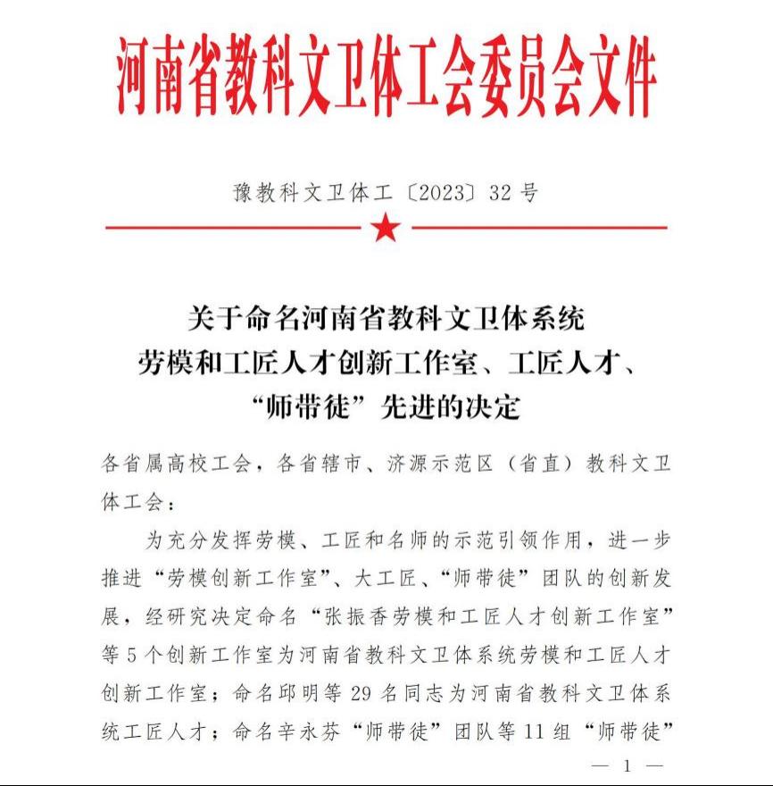 近日,河南省教科文卫体工会委员会发布《关于命名河南省教科文卫体系统劳模和工匠人才创新工作室、工匠人才、“师带徒”先进的决定》,我校电气工程学院党总支书记张延获“工匠人才”命名。